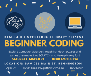Stay up-to-date on everything happening: Join the BAM Facebook Group. Youth ages 7+ are invited to come explore computer science through coding. Hands-on puzzles and games start the adventure in the physical world, then we’ll move into Scratch and try out Makey-Makey! McCullough Library, 4-H and BAM are teaming up for this geeky-fun Saturday workshop. Bring a brown bag lunch to re-fuel midway through. No experience necessary. Come check it out! RSVP: kimberly.griffin@uvm.edu The Bennington Area Makerspace provides opportunities for connection to the entire community via intellectually and physically creative activities. We are building an accessible, open, and safe space for the community to explore science, technology, engineering, arts and mathematics (STEAM) skills and support entrepreneurship by making things and making connections. The guiding principle of BAM is to enable transdisciplinary collaboration and intergenerational exchange to feed curiosity, support discovery, and encourage entrepreneurial development in the Bennington area. For more information about BAM please visit us online at www.bamvt.com.
